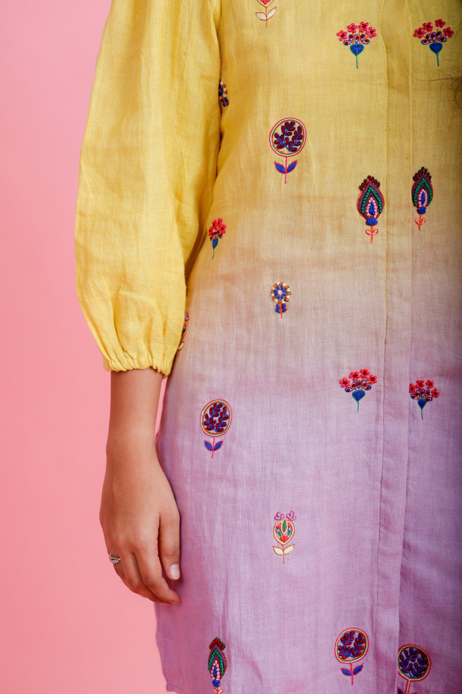 The linen kurta pant set - lemon to lilac kurta with colourful hand embroidered motifs paired with lilac straight-fit pants and scalloped hem.