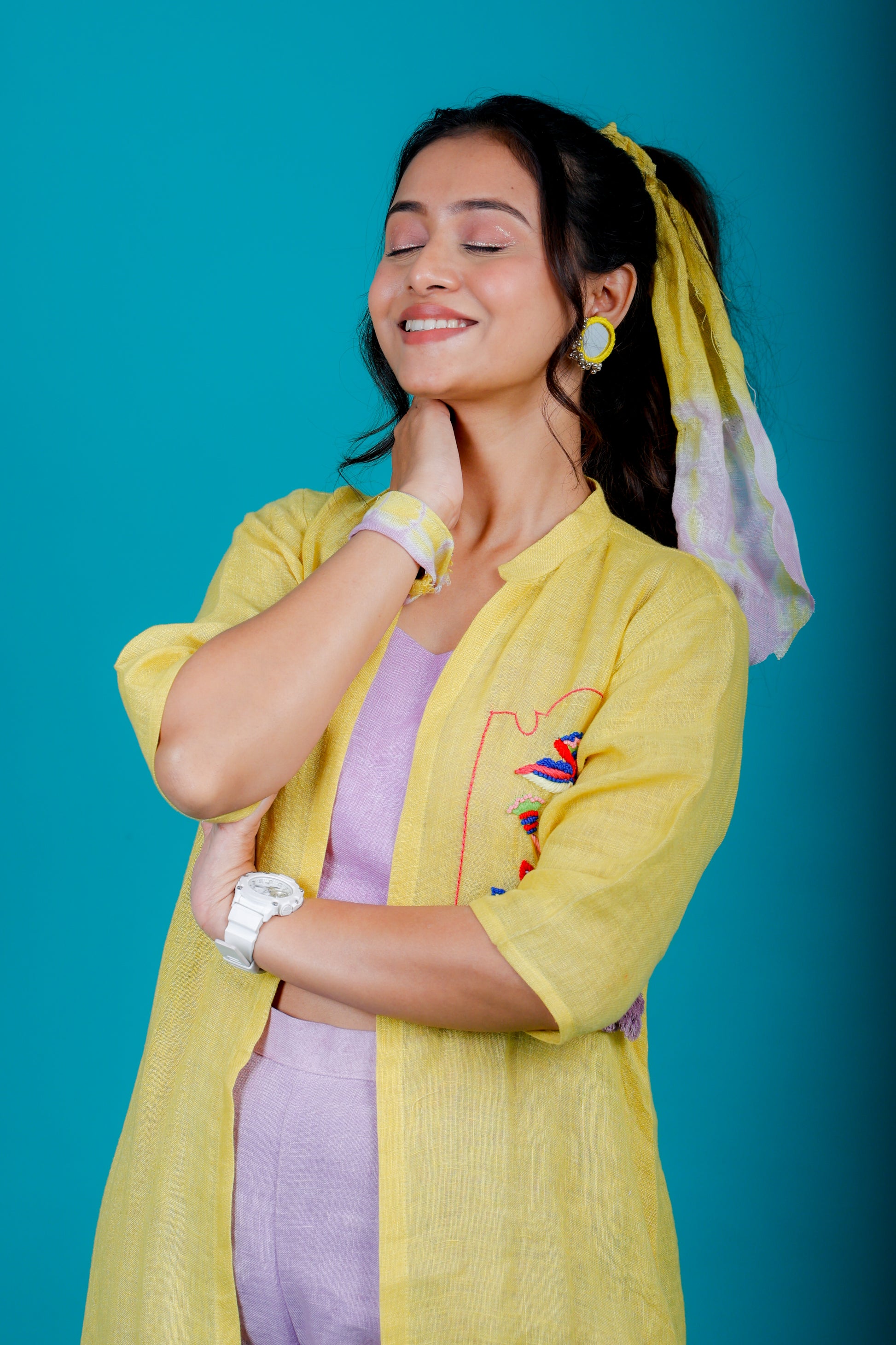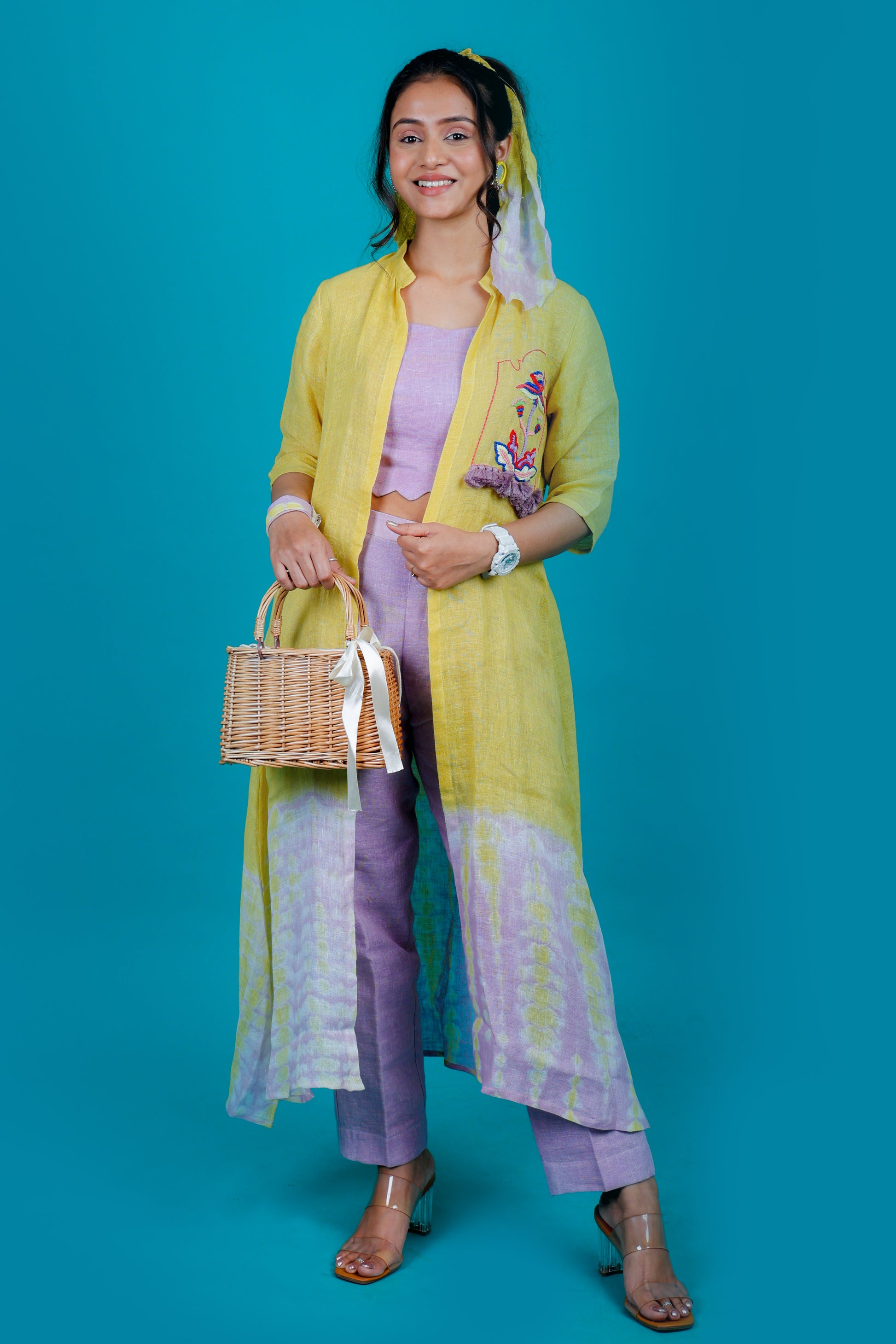 The linen coord set - mustard and lilac tie-dye jacket with colourful hand embroidery paired with lilac straight-fit pants and a lilac crop top with scallop details at the hem.
